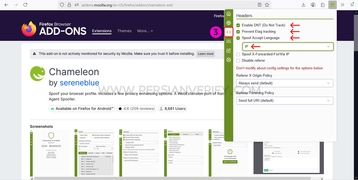 برای مقابله با این روشهای ردیابی و حفظ حریم خصوصی، میتوانید از مرورگر فایرفاکس به همراه یک افزونه قدرتمند به نام Chameleon استفاده کنید. این افزونه به شما این امکان را میدهد که اطلاعات مرورگر خود را جعل کرده و از شناسایی شدن توسط وبسایتها جلوگیری کنید.